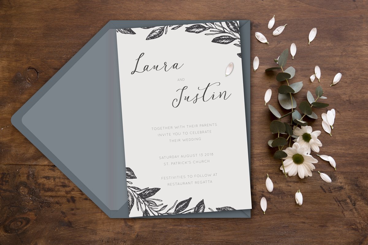 Hand drawn leaf wedding invitation. Available here as white ink printing.