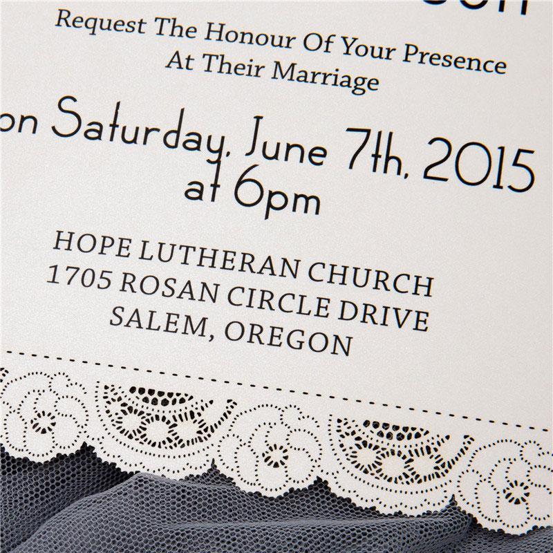 Flat laser cut style invitation with a lace doily design at the top & bottom.